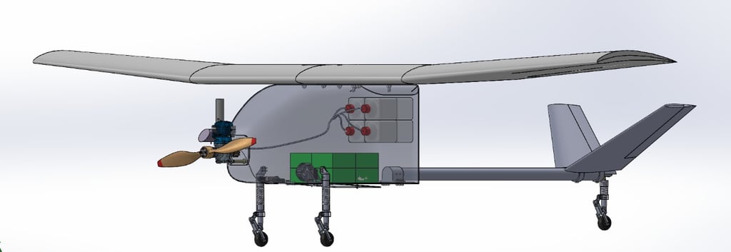SAE Aerothon 2021 aircraft design, showing a transparent version exposing the fuel tanks, payload, payload mechanism and IC engine.