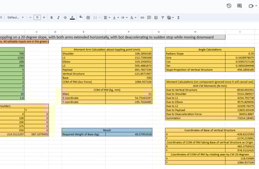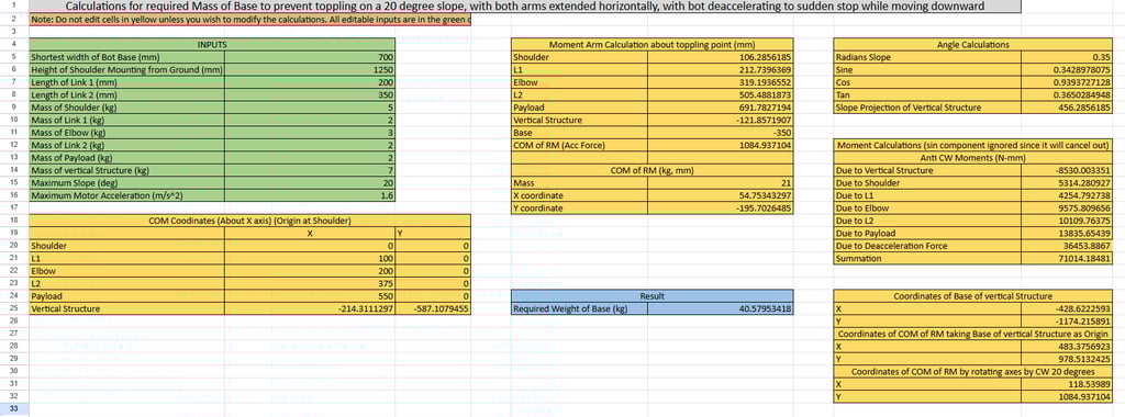Since the payload on the UGV (consisting of a tall frame and a robotic arm) would result in a high center of gravity, Stability calculations were done to ensure that the robot's stability polygon is sufficient to manage the payload without toppling. Parameters such as the Center of Mass (COM) of each section of the robot, maximum slope angle, maximum acceleration, track width, and wheelbase of the robot were considered in the calculations.