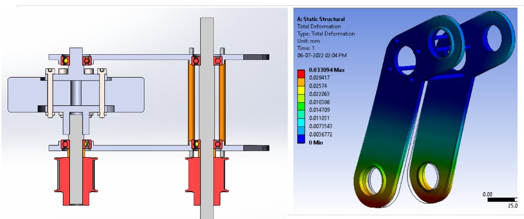The suspension system, constrained by extension springs was simulated in SOLIDWORKS motion, to ensure the suspension geometry traverses standard obstacles according to Hospital codes (Steps, railing, etc.). The simulation videos below compare the UGV without suspension (LEFT) to those with suspension (RIGHT). A screw-based pre-load assembly was implemented to adjust the extension spring pre-load based on the payload on the UGV.